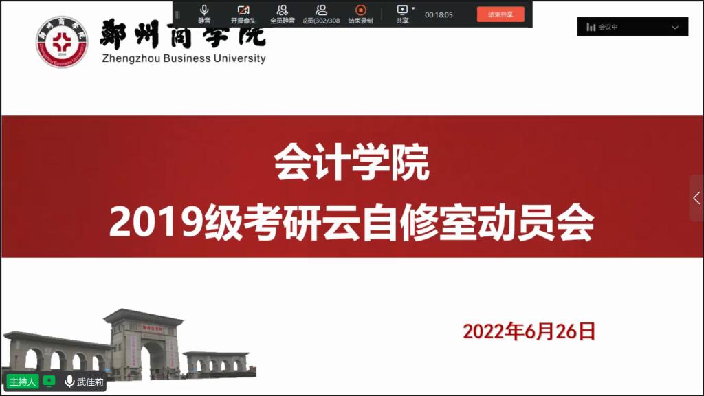 为了更好地实现分层分类教学目标,提升2019级考研学生的学习效率,我院于2022年6月26日下午召开了2019级考研云自修室动员会,此次会议由会计学院院长祝利芳、党委书记梁鹏、副院长刘金金、会计学院考研职能组成员、2019级辅导员、2019级考研班全体学生等参加,此次会议采用钉钉视频会议的方式开展,由会计学院考研职能组老师武佳莉主持。