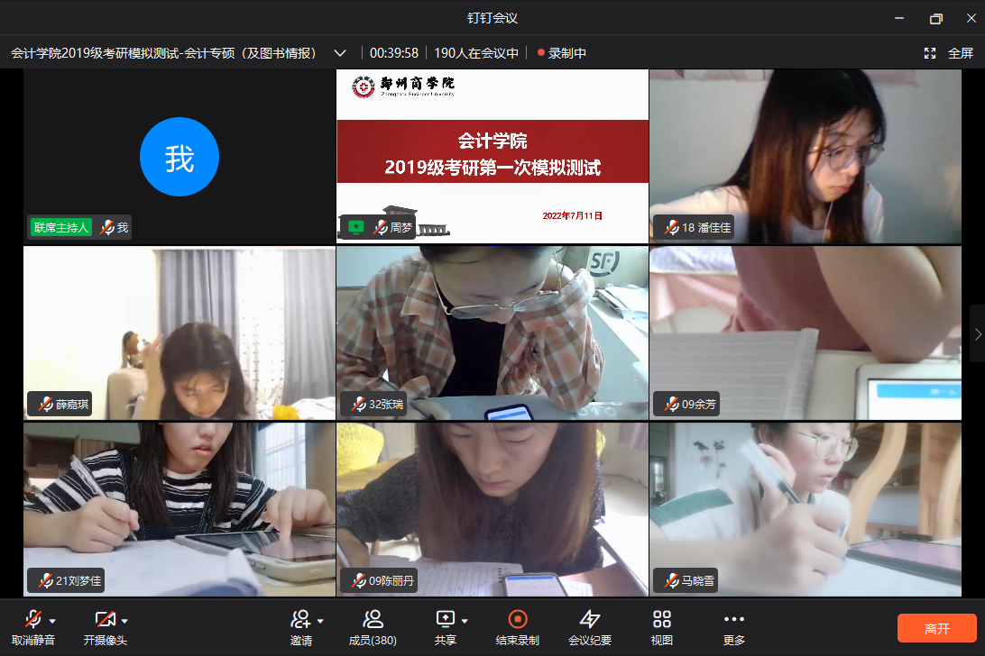 为进一步落实beat365本科分层分类教学工作要求,提升学生考研备考质量,依据《会计学院考研主题教育指导方案》,2022年7月11日,会计学院在线上举行2019级第一次考研模拟测试,共303名学子参加此次模拟考试。