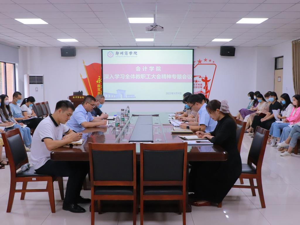 为深入学习全体教职工大会上董事长书面致信和马书臣书记党委工作报告、吴泽强校长校务工作报告精神,持续深化教育改革,提高我院人才培养质量,9月9日上午,会计学院在103会议室召开深入学习全体教职工大会精神专题会议。校党委副书记兼纪委书记裴晓涛、学务处处长路程,会计学院院长祝利芳、党委书记梁鹏、副院长刘金金及全体教师和辅导员老师参会。会议由学院党委书记梁鹏主持。