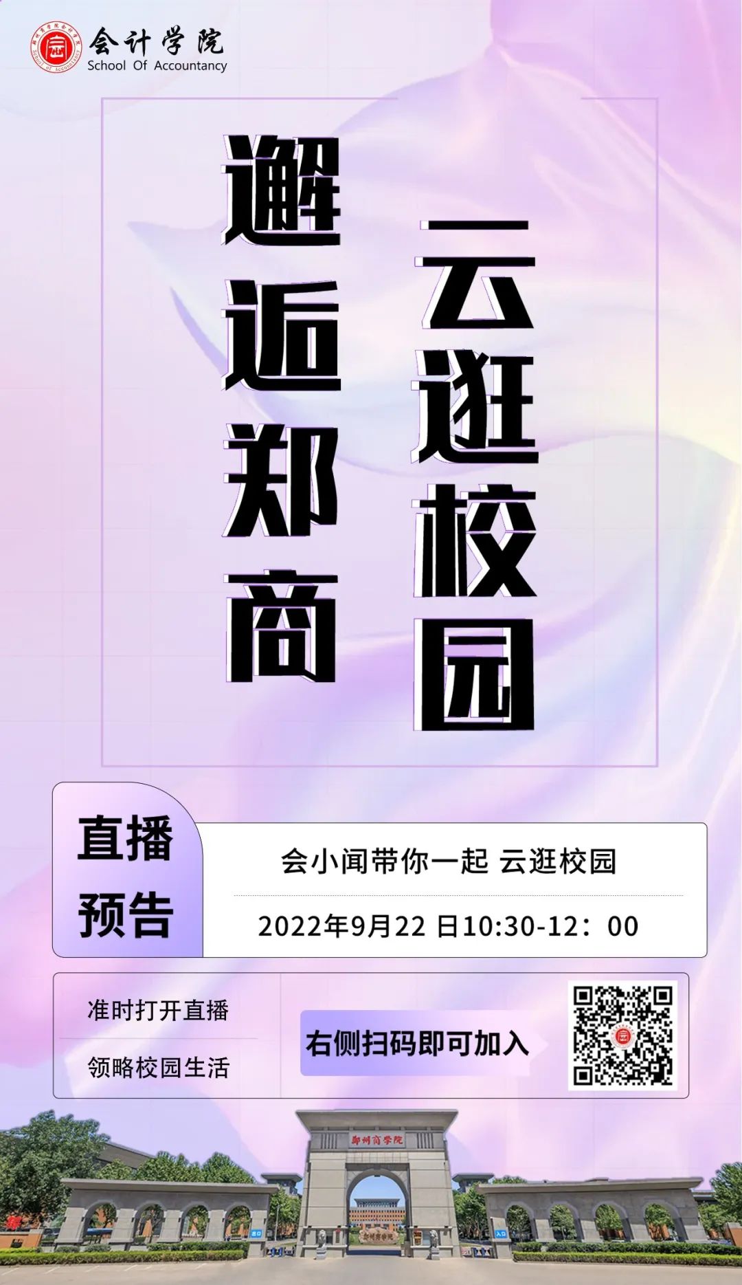 第一场《“邂逅郑商,‘云’逛校园”》直播逛校园。在主持人的引导下新生通过直播方式云游校园,主持人耐心细致讲解校园文化以及各种教学设施,创办人的教育情怀、大礼堂的高贵典雅、图书馆的浩瀚书海、学生事务中心的热情服务、篮球场上的青春热血等都让新生对大学四年充满期待。
