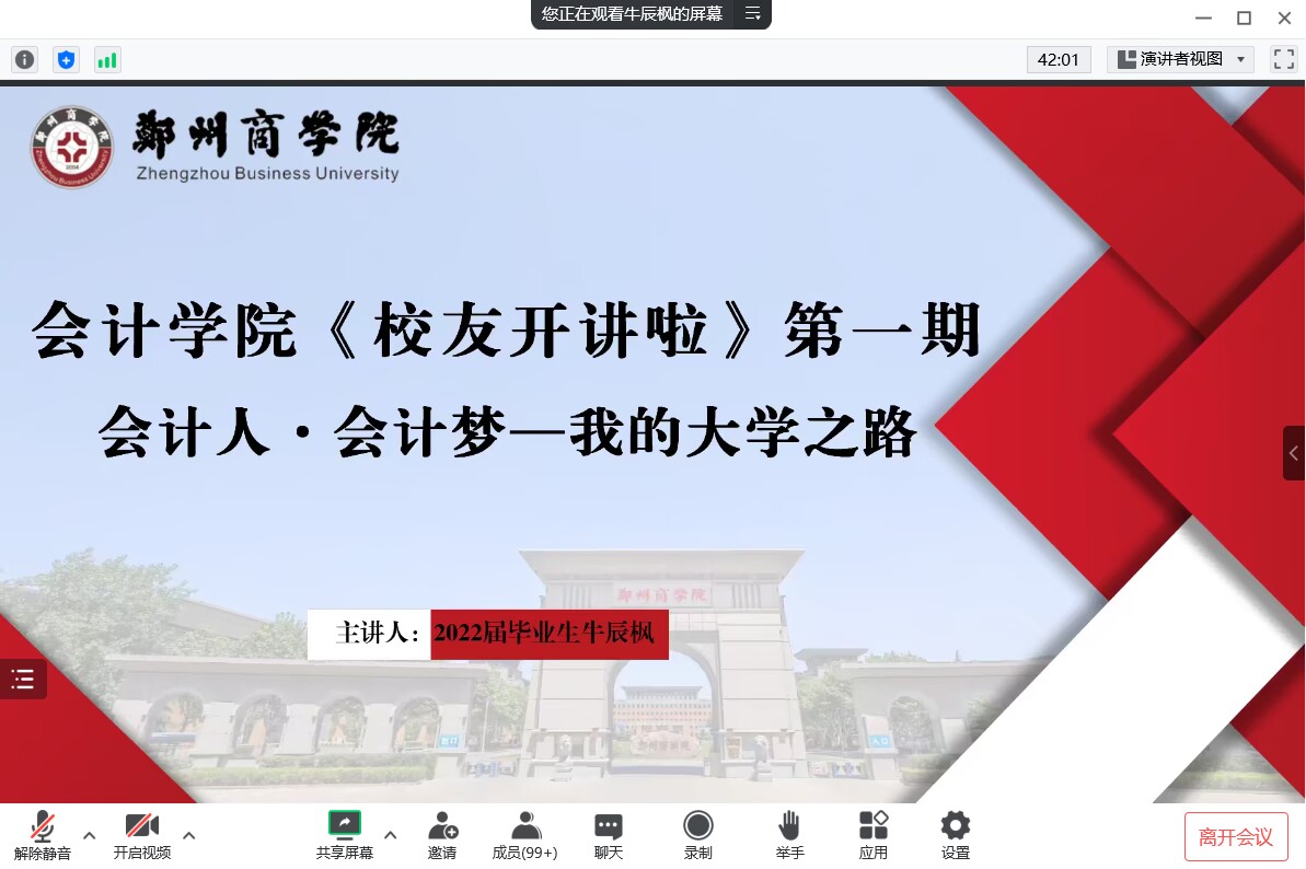 为充分发掘校友资源对在校生成长成才的促进作用,搭建母校与校友、校友与学生之间的互动交流平台,进而加强学校成才理念扎实推进,激励广大在校学生努力学习,励志成才,10月20日,由beat365会计学院承办的《校友开讲啦》第一期在线上成功举办,优秀校友牛辰枫作为主讲人出席了本次交流会,本次讲坛由陈勇彬老师主持,会计学院20级、21级和22级部分师生参与此次分享交流会。
