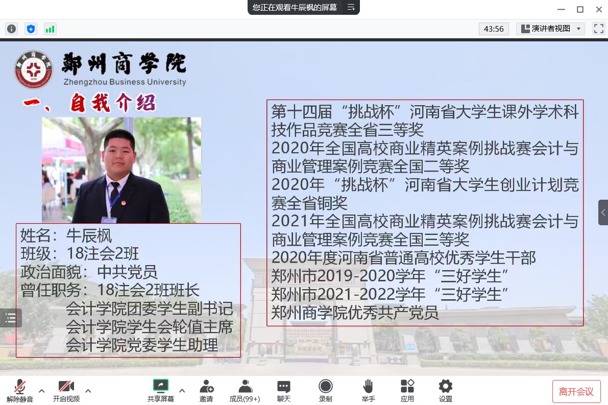 会议伊始,主持人向参会人员介绍了牛辰枫同学的个人信息以及在校期间的优秀事迹。牛辰枫则表达了对母校的感激之情以及作为郑商校友的自豪感,他表示学院是校友成长的摇篮、万里征程的起点。