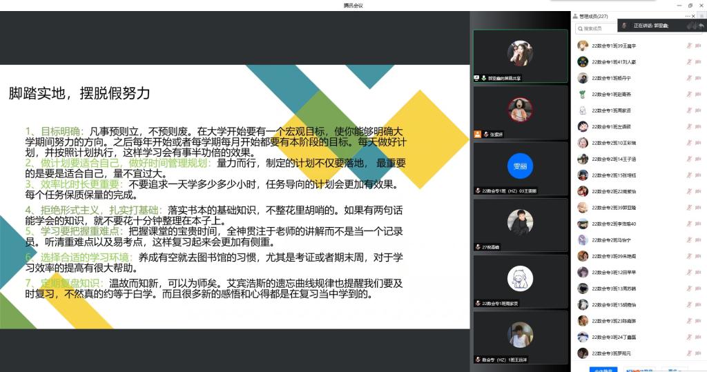 随后,郭亚鑫结合自身的学习经历,分享了自己的升学成功经验,用诚恳感人的言辞、催人奋进的事迹使得在场的同学感受到了强烈的震撼,激励同学们努力学习,脚踏实地,摆脱假努力。她说在大学期间要明确自己的目标,做好适合自己的计划,做好时间管理规划,提高自身学习效率,拒绝形式主义,扎实打好基础。此外,她还分享了要学习把握重难点,选择合适的学习环境,定期复盘知识等学习经验,使同学们受益匪浅。