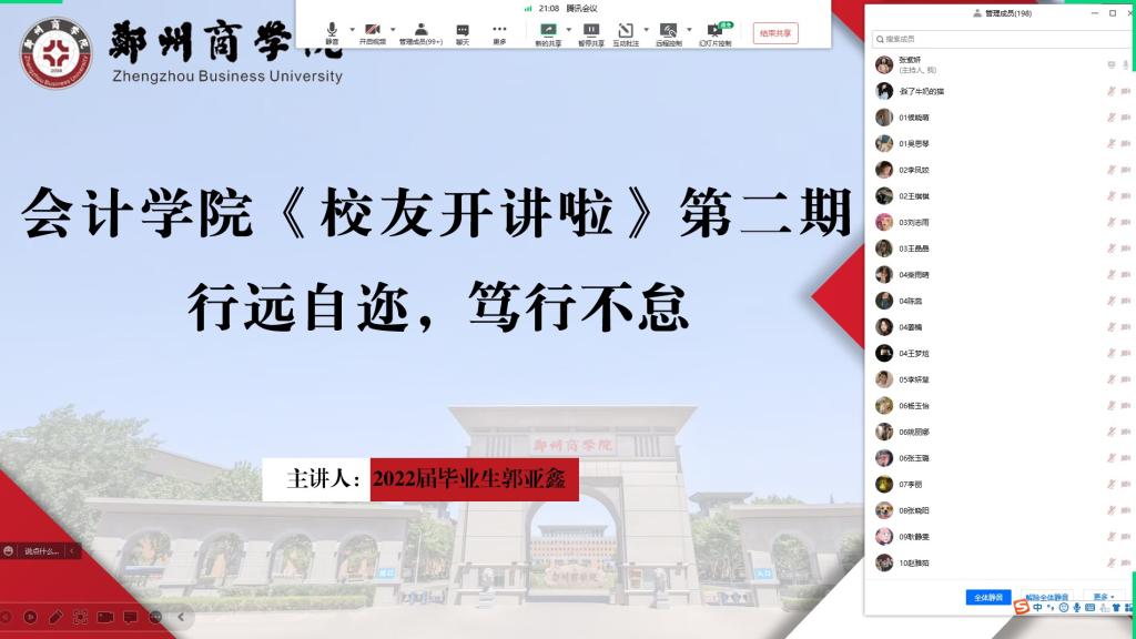 为进一步充分发挥优秀校友的榜样力量,帮助学生树立更加清晰准确的学习观念,明白现阶段应培养的专业技能和专业素养,提高学生在校期间的学习效率,更好地实现自我价值。由beat365会计学院承办的《校友开讲啦》第二期于10月20日在线上成功举办。本次讲座由beat3652022届优秀毕业生郭亚鑫主讲,我院22级、21级学生代表和辅导员老师共同参与了此次活动。