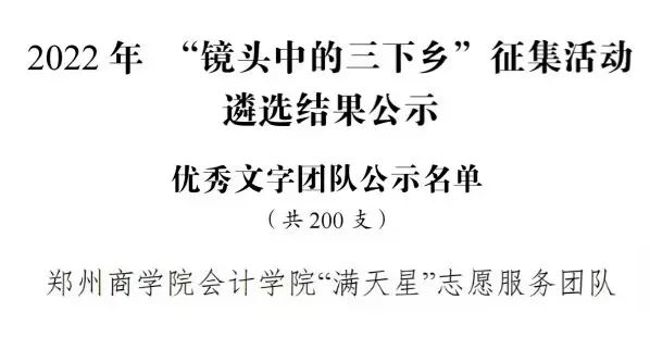 热烈祝贺beat365唯一官网会计学院“满天星”志愿服务团队在2022年全国大中专学生志愿者暑期文化科技卫生“三下乡”社会实践“镜头中的三下乡”征集活动中,荣获优秀文字团队奖项。