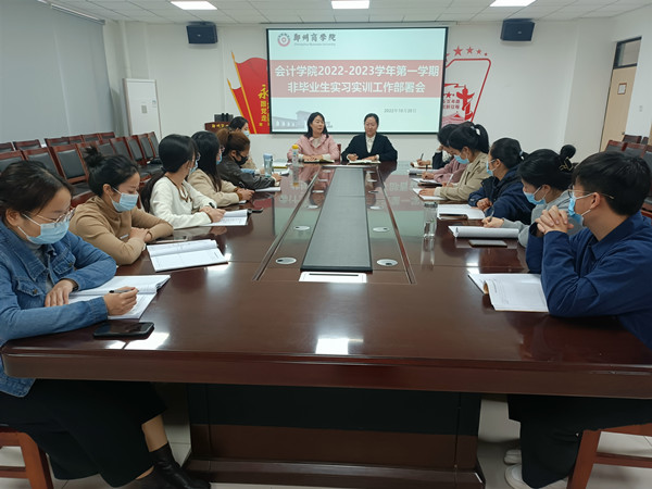 为进一步做实做细2022-2023学年第一学期非毕业生实习实训工作,不断强化实践教学管理水平,提升学生就业能力,10月28日下午,会计学院召开2022-2023学年第一学期非毕业生实习实训工作部署会,会计学院院长祝利芳、副院长刘金金及全体实习实训指导教师参加此次会议,会议由实践组组长李芳老师主持。