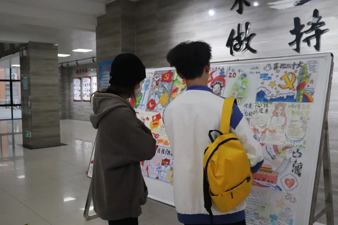 在作品展示期间,过往的同学们也驻步细细品读优秀绘画作品,展板上的一幅幅绘画不仅展示了我院学子对待生活积极向上的态度,同时也能感受到会计学子永远跟党走、奋进新征程的赤忱之心。