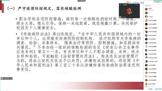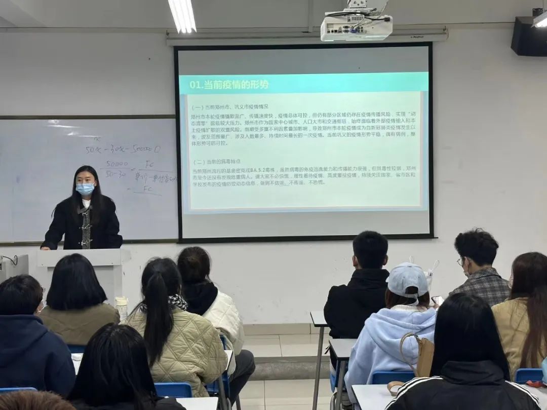 各班辅导员详细分析省内当前疫情防控形势,结合近期部分高校违反疫情防控典型案例,详细解读学生违纪案例带来的后果,做好警示教育,不造谣、不传谣,并向同学们强调要服从学校疫情防控要求,积极配合做好核酸检测、健康监测等各项疫情防控措施,不瞒报不漏报。倡导同学们学会在疫情期间合理安排学习和生活,养成健康生活习惯,提高自律能力与自我防护意识。