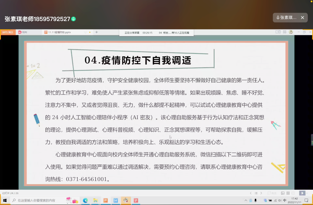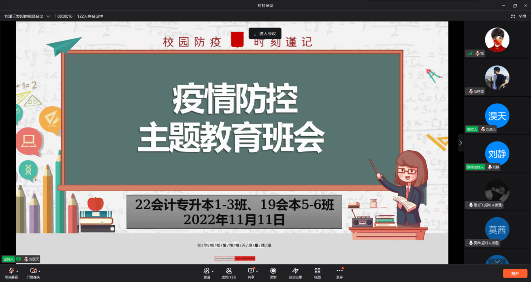 为进一步落实落细学校疫情防控的各项工作要求,增强同学们的疫情防护意识,切实提升同学们的自我防范能力。11月11日晚,会计学院辅导员按学务处工作要求组织各班召开疫情防控主题班会。