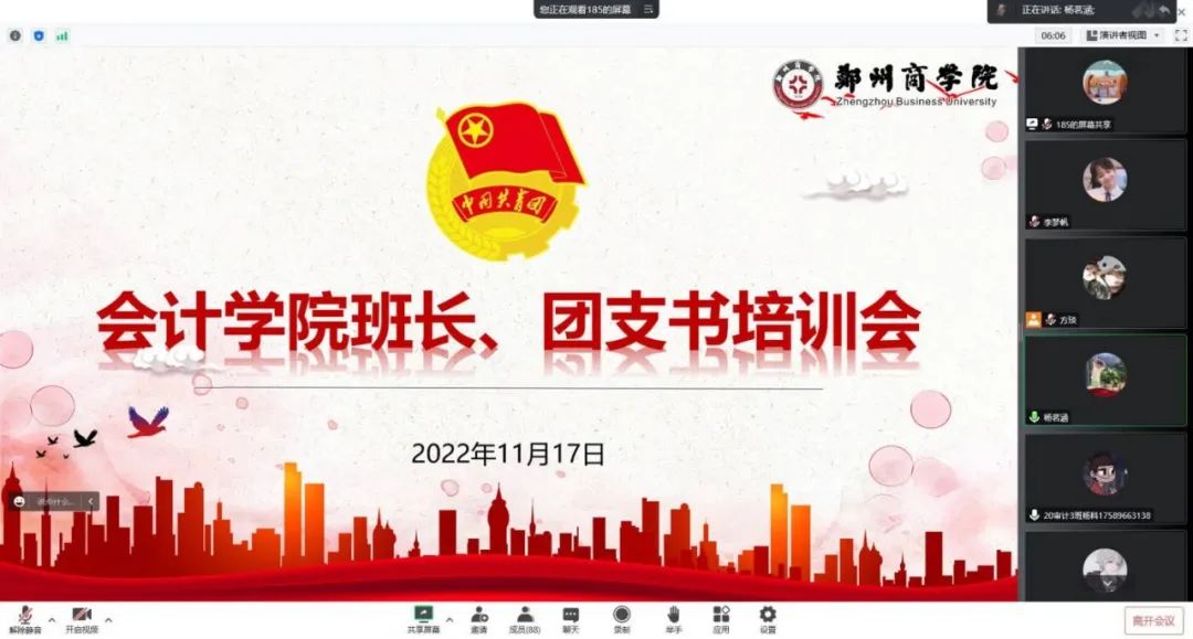 为充分发挥学生干部在“自我管理、自我教育、自我服务”中的先锋模范作用,进一步提高我院学生干部管理水平及综合素质,11月17日,会计学院召开了班长、团支书培训会。本次会议以线上会议的形式进行,由会计学院团委书记兼行政秘书杨茗涵主讲,会计学院21级、22级各班班长、团支书参与此次会议。