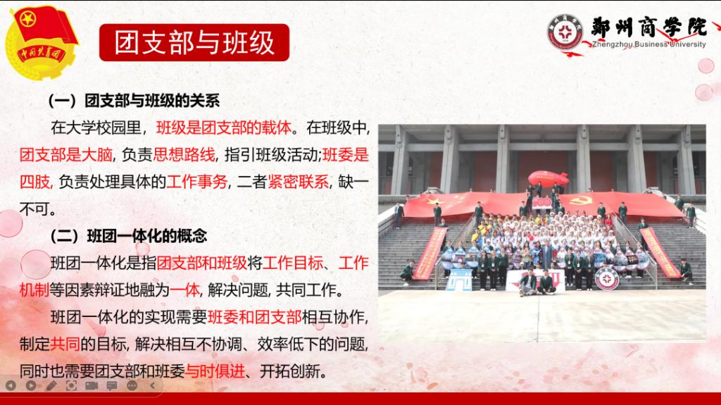 会上,杨茗涵书记围绕“班团一体化”为同学们展开了讲解培训。她用生动形象的语言让同学们明白了团支部和团干部的含义,在提高了同学们对班团工作的认识的同时,也帮助同学们更加明确地认识到了自己的职责所在。同学们通过对班团一体化制度下的团支部工作的具体内容和具体开展方式的学习,明确了未来班级班团活动的发展方向,更有信心,有把握地完成自己的工作任务。