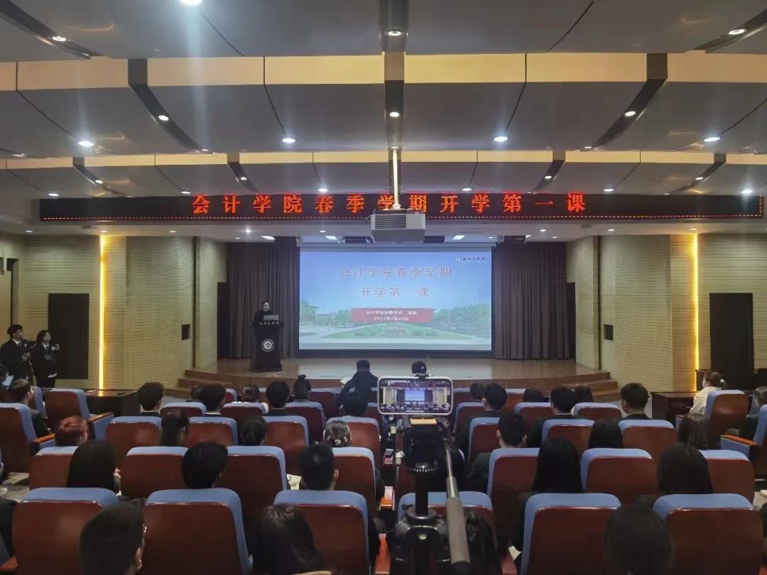 为深入学习贯彻党的二十大精神,聚焦立德树人根本任务,贯彻落实期初校领导党政工作报告精神,2月22日晚,会计学院在图书馆五楼学术报告厅举行2023年春季学期开学第一课,会计学院院长祝利芳、党委书记梁鹏、团委书记杨茗涵、全体辅导员老师及学生代表在主会场参加会议,会计学院无课学生通过钉钉联播形式线上观看学习。会议由团委书记杨茗涵主持。