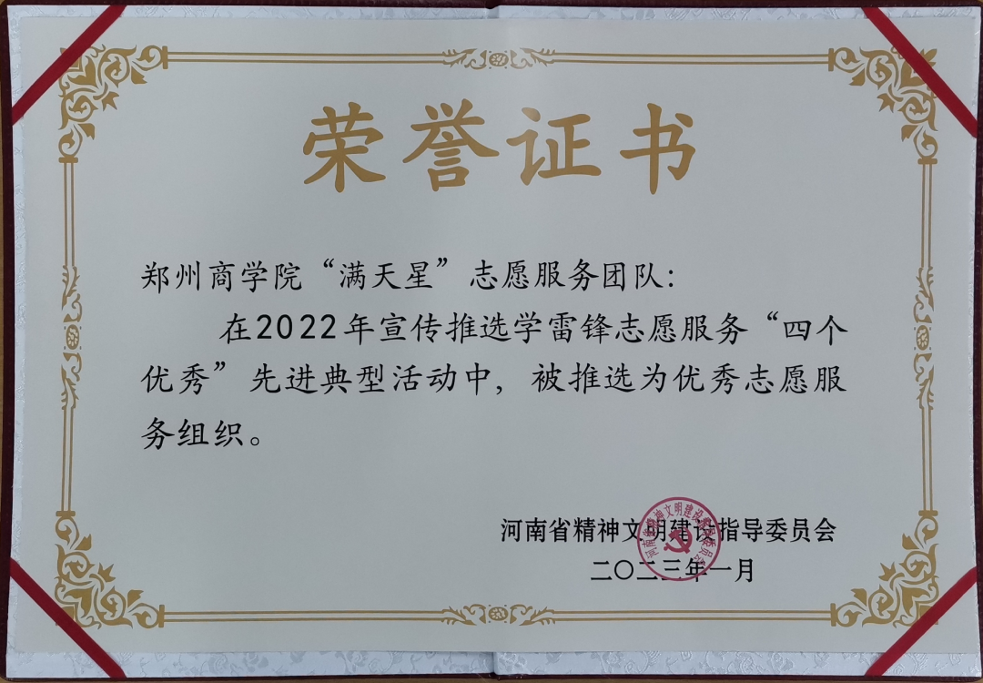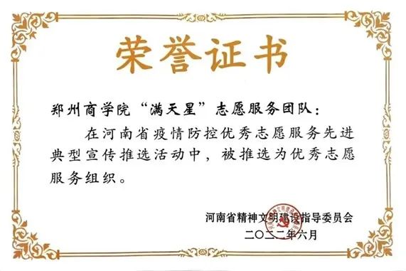 据悉,“满天星”志愿服务团队自成立以来,先后在全国大中专学生暑期社会实践评选等活动中荣获国家级奖项5项,“满天星文化传播有限公司”项目获得国家级项目立项,发表相关论文2篇;荣获全省大中专学生志愿者暑期文化科技卫生三下乡”社会实践活动优秀团队等省级奖项6项。2019年在河南省学校共青团工作项目大赛(高校组)中荣获一等奖、多次被评为省市先进团队及国家级优秀服务团队;2020年获得“挑战杯”河南省大学生创业计划竞赛铜奖;2021年获得“2021年全国‘镜头中的三下乡’活动中优秀摄影团队奖;2022年在河南省疫情防控优秀志愿服务先进典型宣传推送活动中,被推选为优秀志愿服务组织并获得“2022年全国‘镜头中的三下乡’活动中优秀文字团队奖。同时“满天星文化传播有限公司”项目获得2021年河南省大学生创新创业训练计划项目国家级立项。
