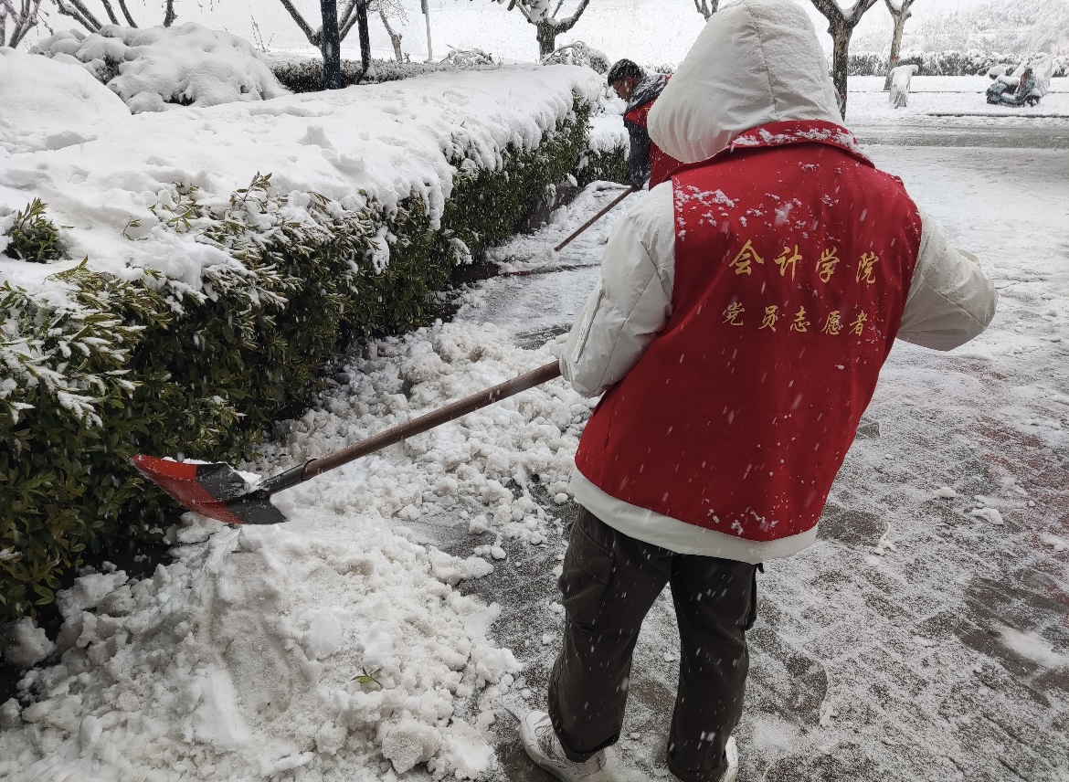 一场大雪给校园披上盛装,同时也给师生们的出行带来了安全隐患,校园道路上出现积雪结冰、路面湿滑现象。为保证师生们安全出行,会计学院学生第八党支部组织党员开展清雪活动,以实际行动践行初心、担当使命。党员们齐心协力、分工合作,干劲十足,冰雪覆盖的路面在不断铲扫中逐渐露出原本面貌。党员们忙碌的身影也成为了会计学院一道亮丽风景线。这不仅是清扫出安全畅行的道路,更是扫除会计人心中严寒。