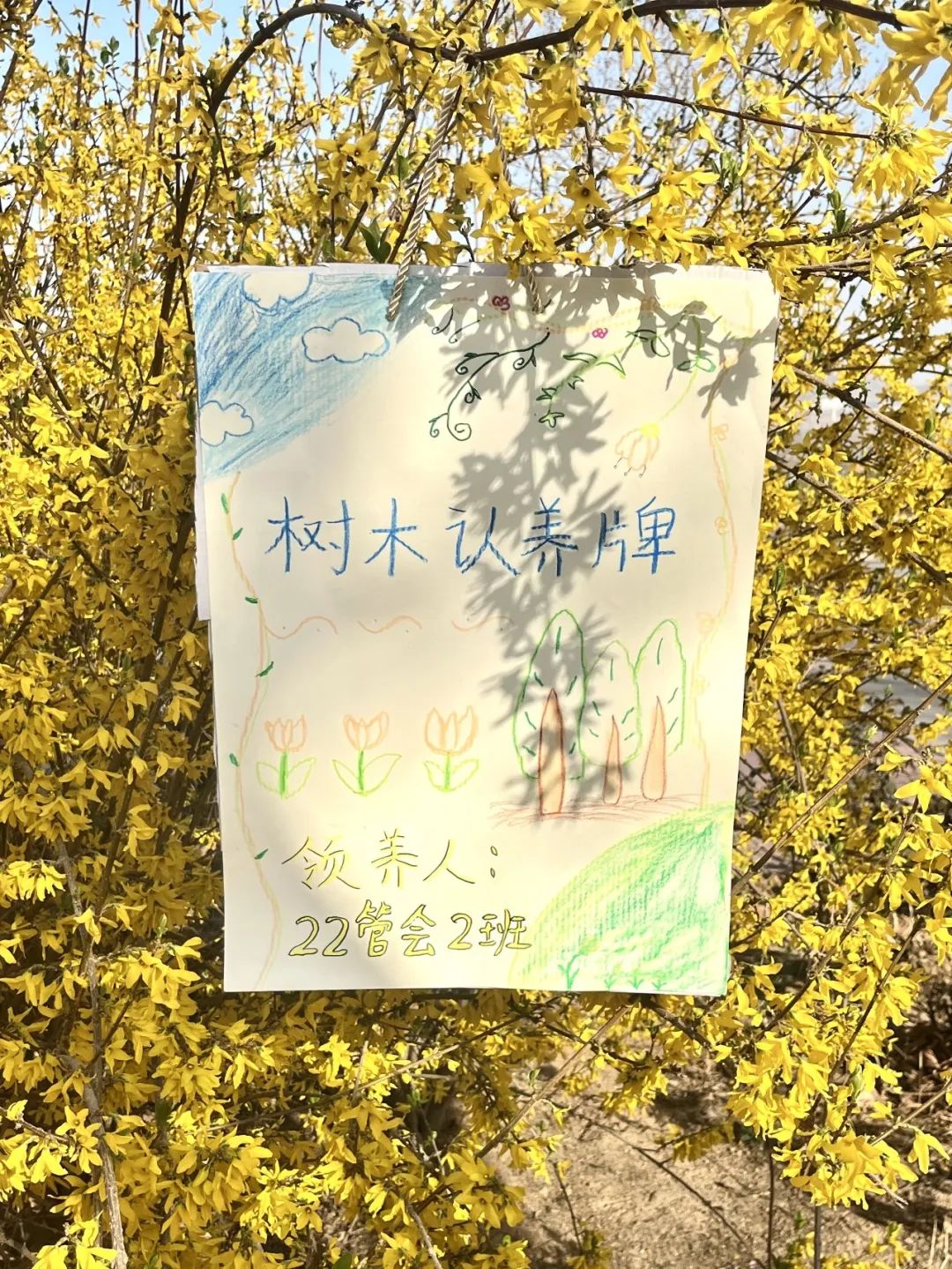 活动中,参与班级利用废弃纸盒进行裁剪,用画笔进行创作,将班级名称及对于环保、绿色理念的想法用文字和图案制作成班级名牌,悬挂在班级所认养的树上,给树木增添了别样的风采。远远看去,一排排挂着名牌的认养树,成了春日校园里一道靓丽的风景线。