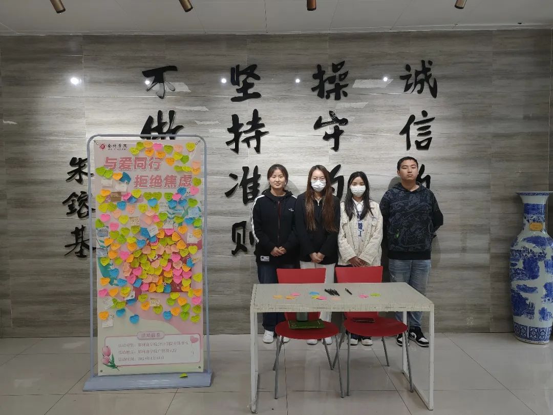 花期不同,不必焦虑。为了在丰富学生课余生活的同时也能抒发情感,告诉大家停止内耗,拒绝焦虑,促进学生心理健康,更好地享受当下的生活,希望大家在人生的旅途中停止焦虑,向阳而生。4月25日,我院开展了“与爱同行,拒绝焦虑”心愿便利贴活动。