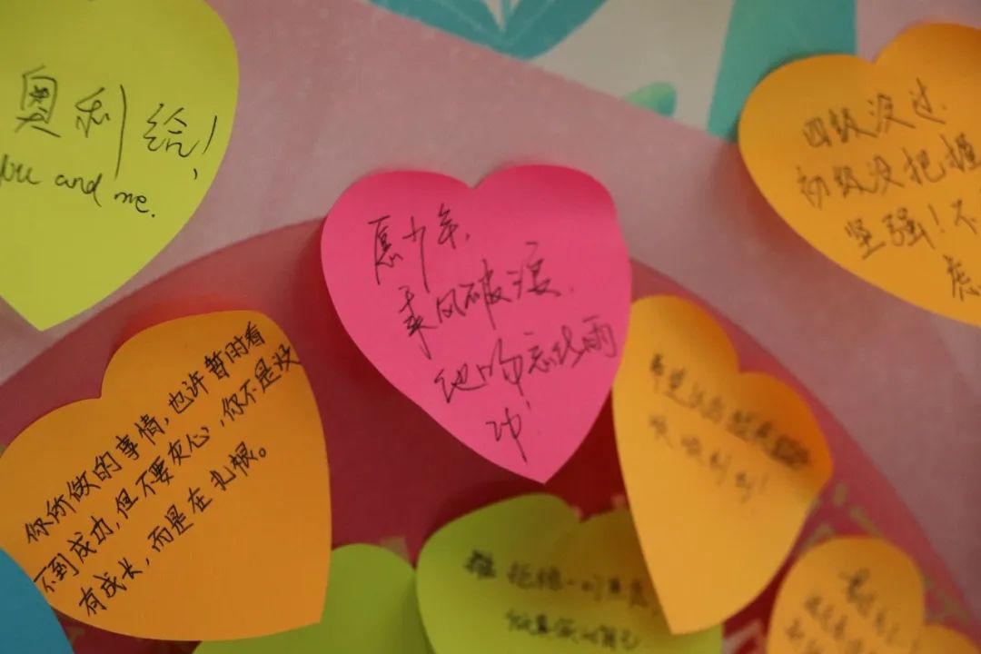 活动现场,同学们纷纷在便利贴上写下让自己开心的事、自己对未来的期望、最近感到焦虑或者烦恼的事情、也有对陌生人的鼓励。