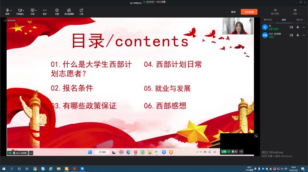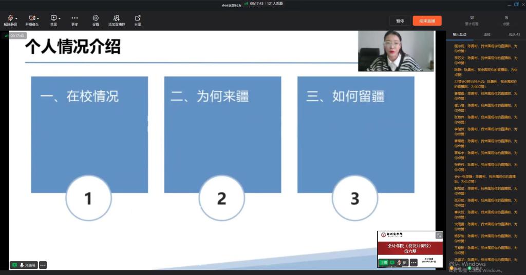 为进一步加强校友与母校的联系,促进母校与各地区校友的沟通,搭建母校与校友、校友与学生之间的互动交流平台,充分发挥校友在帮助我院学子树立正确人生观、价值观及如何理性择业、就业与创业方面的示范和导向作用,帮助同学们明确职业规划、了解职业选择,激励广大在校学生努力学习,励志成才。会计学院于5月9日组织开展了《校友开讲啦》第六期。我院优秀校友张彦静、刘璐瑶与在校师生共话成长,学院全体辅导员老师和200余名学生在线参加活动。