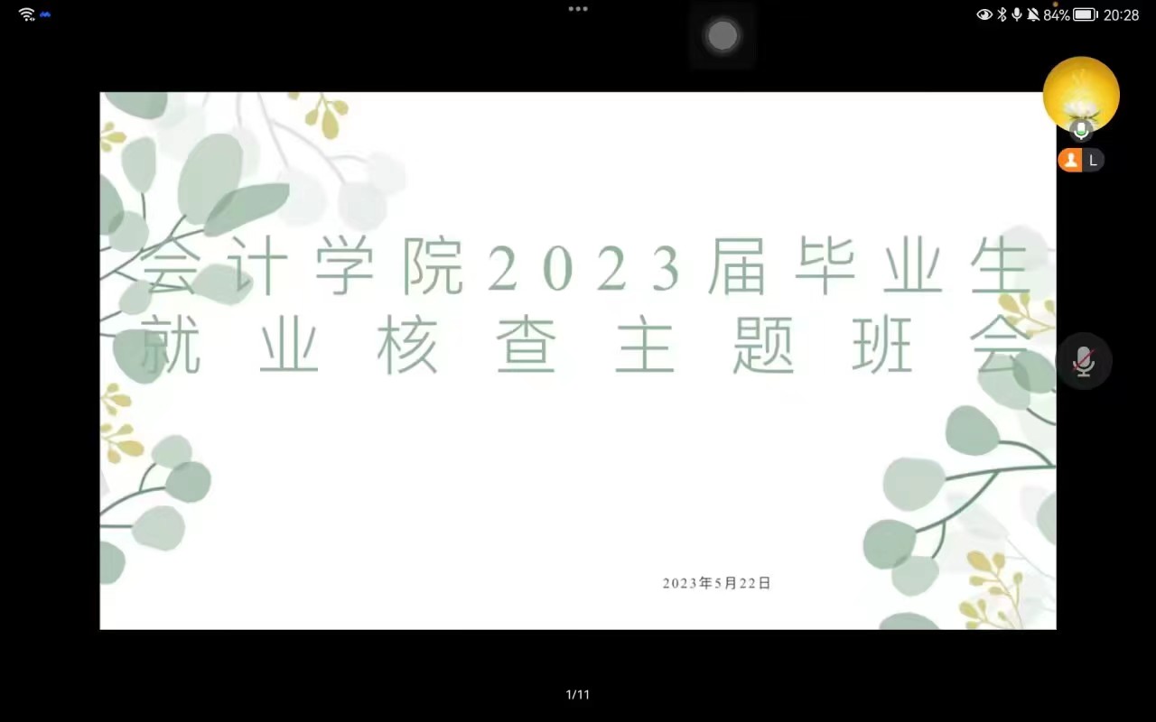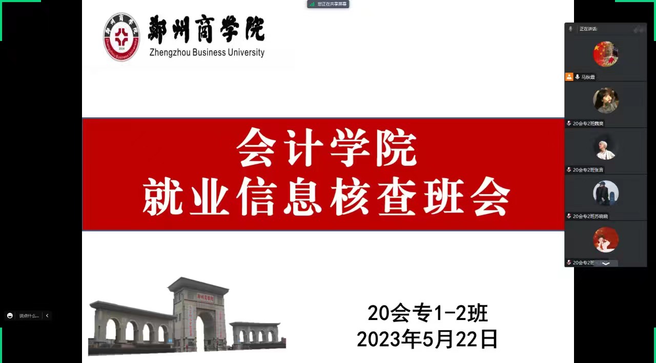 为贯彻落实河南省教育厅关于2023届毕业生就业数据核查工作的要求,根据上级领导部门相关文件的精神指示,做好做实做细学校毕业生就业工作,为确保我院毕业生就业数据真实、准确。5月22日,会计学院组织各班召开线上“2023届毕业生就业信息网上核查主题班会”。