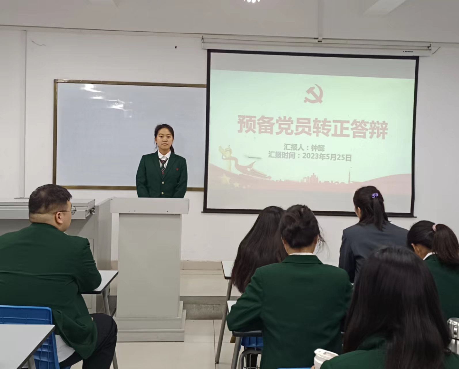 会议伊始,由钟懿、李锦慧、花世林、安亚静4名同志介绍自己从预备期到转正期间就思想、学习、工作等方面进行汇报;随后入党介绍人孙柳阳分别对4名预备党员在学习、思想、实践生活等方面作出全面评价并给予肯定;接着支委会研究讨论预备党员表现情况;随后与会正式党员以无记名投票的形式对4名同志转正问题进行表决,并对以上4名同志能否入党进行充分讨论并发表意见;最后,第七党支部全体成员进行宣誓,重温入党誓词。