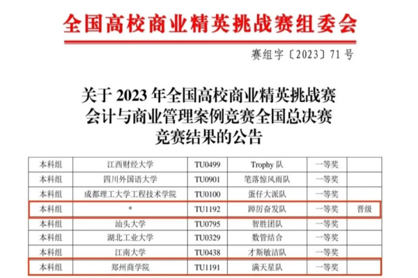 2023年6月10日2023年全国高校商业案例精英挑战赛会计与商业管理案例竞赛全国总决赛成功举办,根据大赛组委会组织有关专家评审,共评选出获奖项目:一等奖374项,二等奖448项,三等奖373项。我院由武佳莉、白静与曹琦老师指导的本科生组“满天星”和“踔厉奋发”代表队成功获得全国总决赛一等奖,其中“踔厉奋发”代表队成功晋级全国总决赛精英赛!