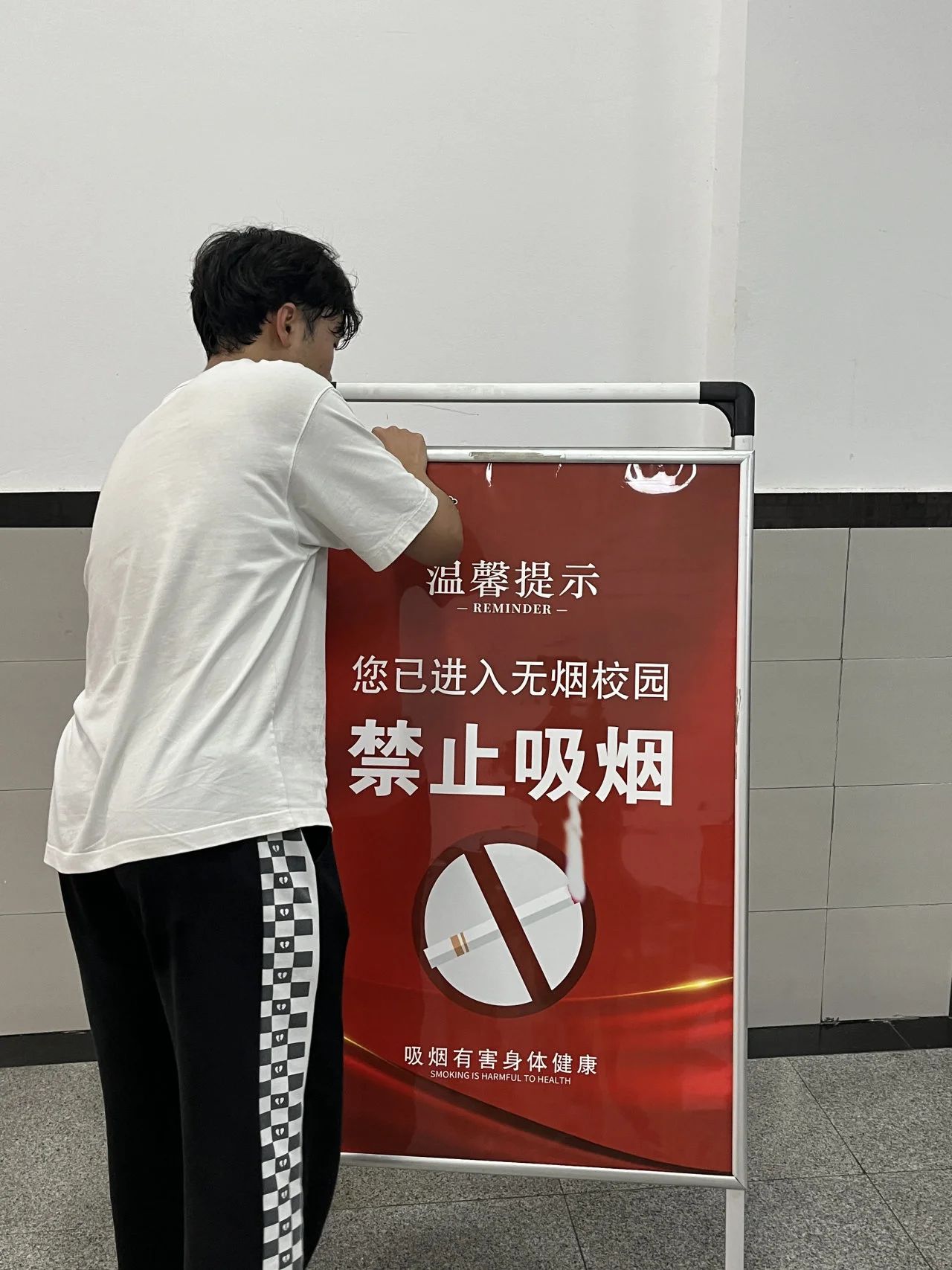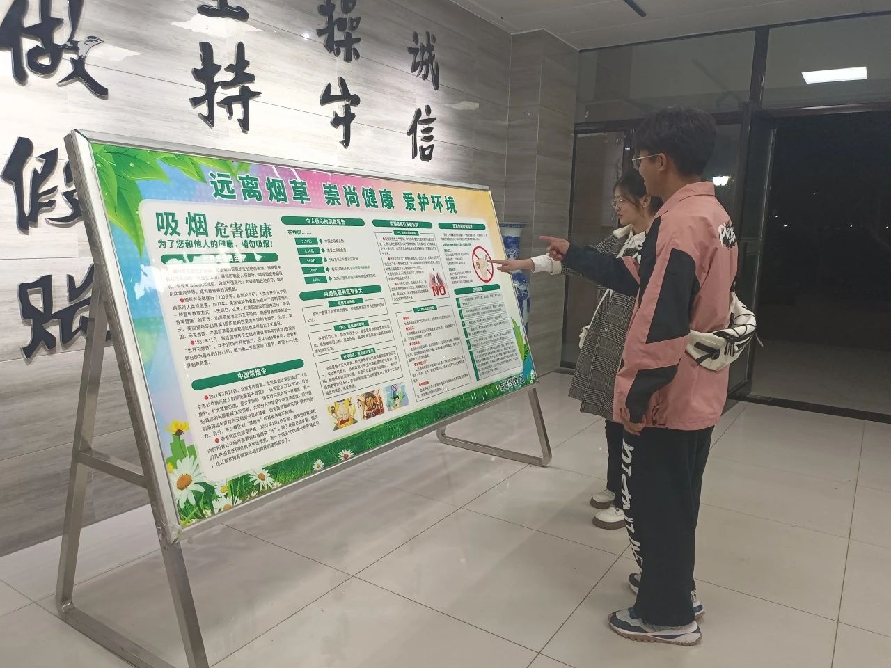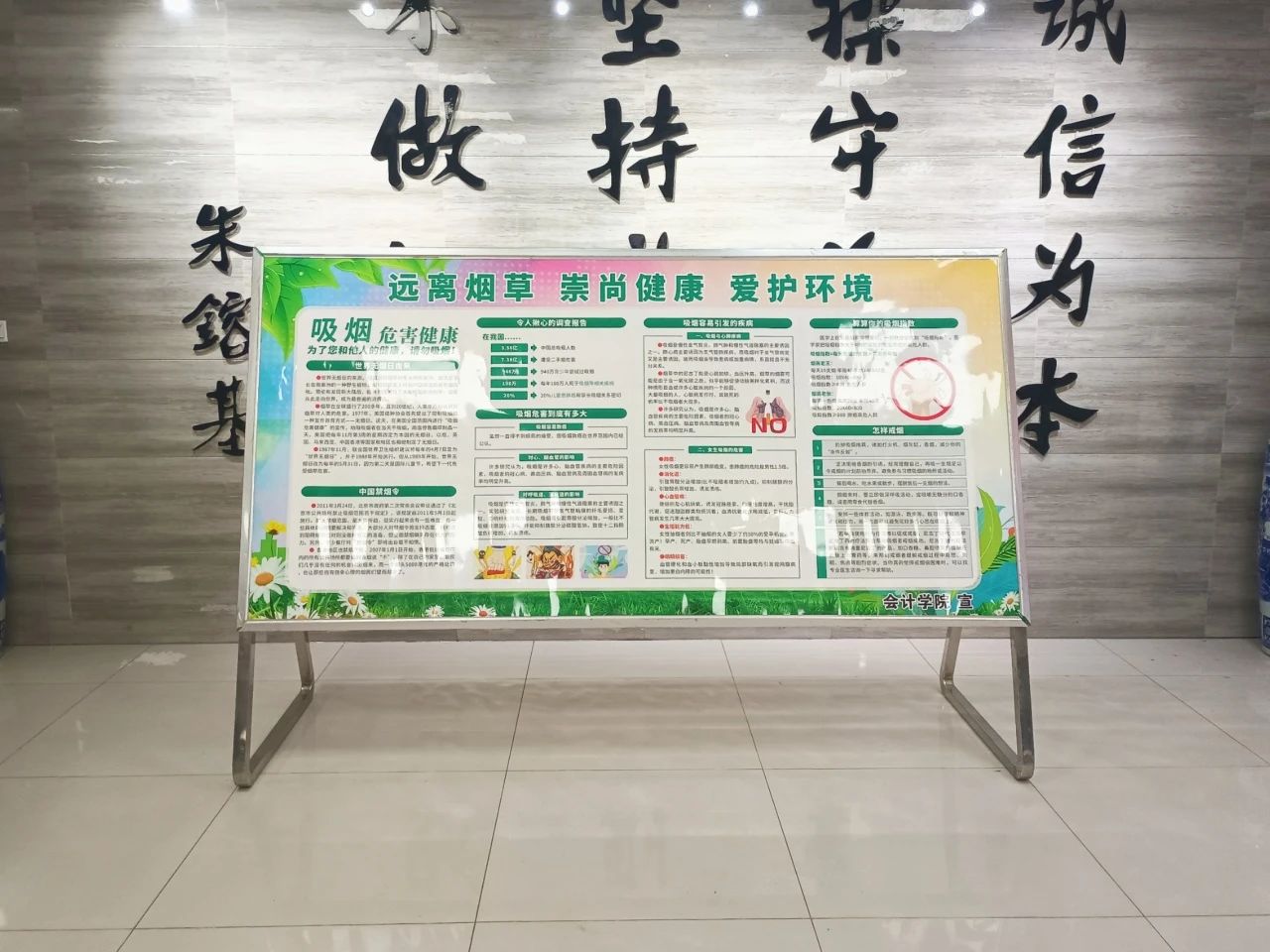 为进一步落实学校以及学院对于学生礼仪教育工作的要求,提高我院师生禁烟意识,更好地把禁烟宣讲工作传递给广大师生群体,让大家能够认识到吸烟的危害性。我院分别在宿舍楼大厅处、教学楼大厅处以及醒目区域放置禁烟宣传海报标识、警示语,叮嘱同学们要为构建无烟校园环境贡献力量。