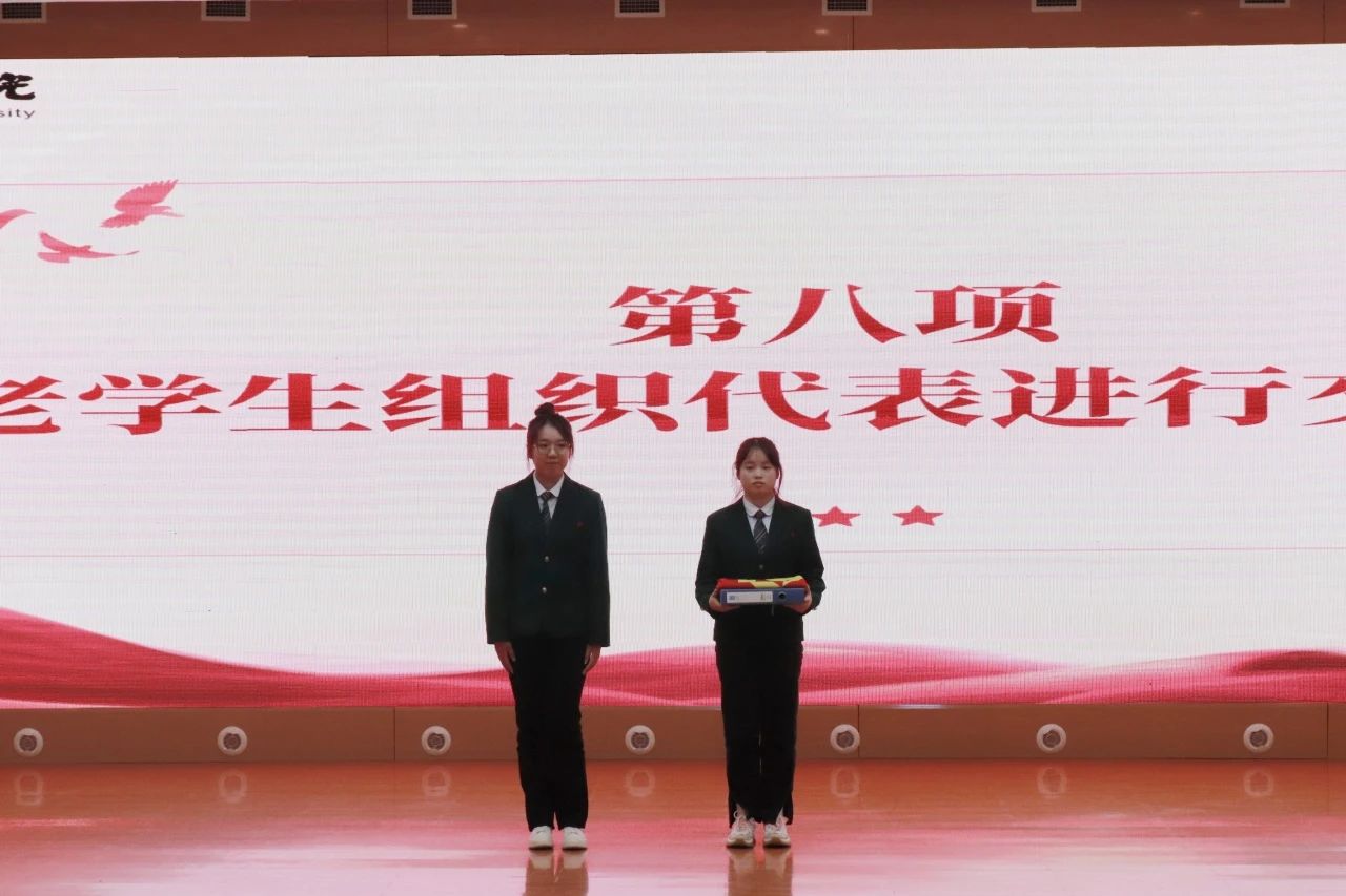20级学生组织代表蔡雨露同学和21级学生组织代表罗秋雨同学进行团旗档案交接仪式。