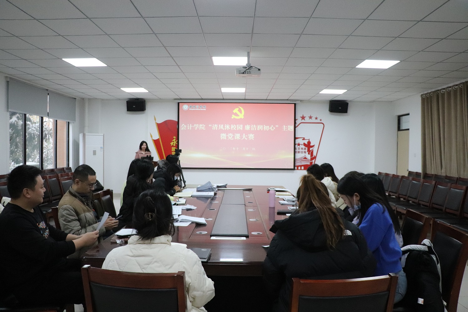 为深入学习贯彻党的二十大精神,全面贯彻习近平总书记关于清廉建设的重要论述和省委关于推进清廉河南建设实施意见,结合《中共beat365唯一官网委员会关于清廉学校建设的实施方案》有关要求,进一步提高各党支部书记的廉洁意识和领导能力,12月12日下午,会计学院在广恩楼103会议室组织开展“清风沐校园 廉洁润初心”主题微党课大赛初赛。会计学院各党支部书记结合自身工作和身边案例,用通俗易懂的语言,围绕“清廉”主题,从多个角度切入,向大家传递了廉洁自律、诚信守法的价值观,通过分享廉洁故事、师德师风建设等方式,传递了廉洁文化的核心价值,引导大家厚植清廉理念,以廉洁文化浸润人心。本次微党课大赛初赛的举办,为各支部书记们提供了一个展示自我、交流学习的平台,也提高了大家对廉洁建设的认识和理解,同时,本次比赛也为会计学院营造了风清气正的工作环境,为会计学院的健康发展提供坚实的保障。