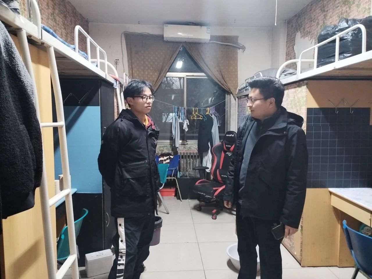 辅导员老师细心检查宿舍内的卫生、电器安全等情况,及时发现并解决潜在的安全隐患。提醒同学们在日常生活中要注意财产安全和人身安全、寝室安全,注意防火防盗、防电信诈骗等。要求同学们加强寝室卫生管理,保持宿舍卫生,创造一个美好生活寝室。辅导员老师与学生面对面交流,了解了同学们的生活和学习情况,同时提醒同学们最近大幅降温,要注意增添衣物,做好安全防护;雪天路滑,注意出行安全。