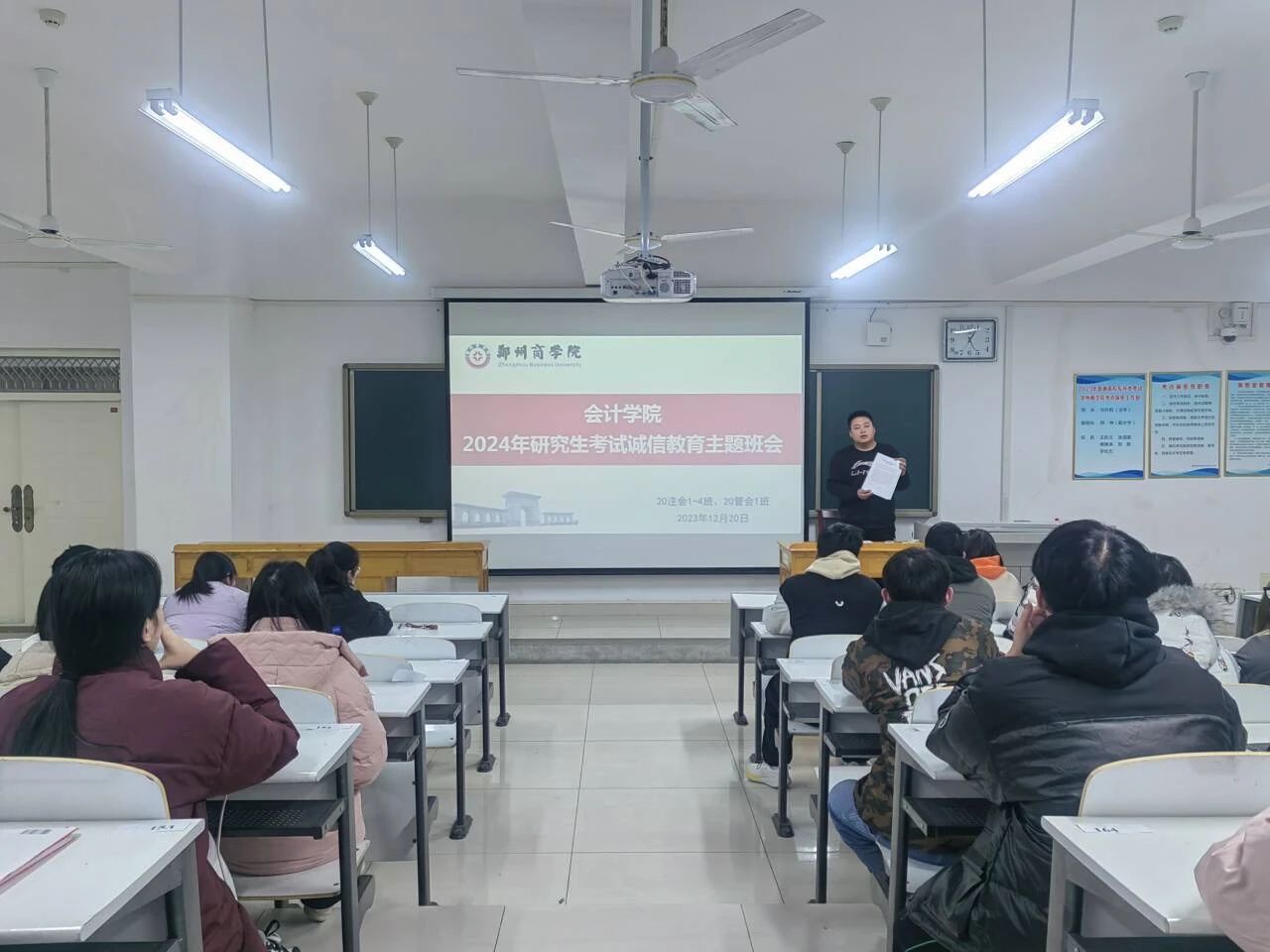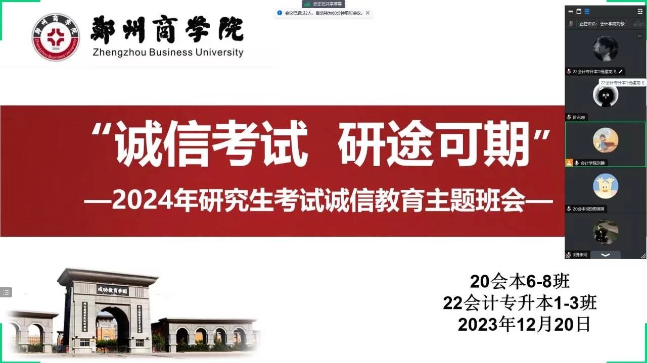 为了严肃考风考纪,加强考研学生的诚信教育,2023年12月20日,会计学院通过线上线下相结合的形式,开展了2024年研究生考试诚信教育主题班会。毕业班辅导员及毕业班考研同学参加。