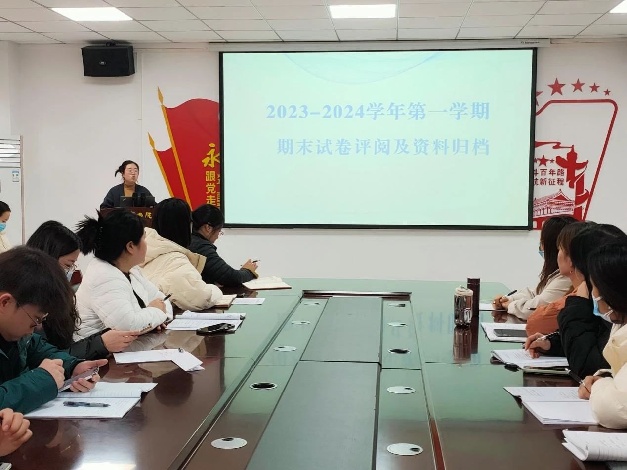 首先,由教学秘书耿玉伟老师对期末考试监考规则进行强调,监考老师要仔细核对考试科目、考场分布以及考试时间,对考场中出现突发事件的处理办法进行详细解读,并提醒主考老师应与监考老师相互协调配合,保障期末监考工作高质量完成。随后试卷组组长胡珍珍老师对期末试卷的批改和归档资料的要求进行传达,并重点强调在试卷批改的过程中分值的计算、得分要点、得分细则以及评分的总规则的注意事项;在期末材料归档方面,重点强调了考试课试卷归档资料和考查课归档资料的注意事项。