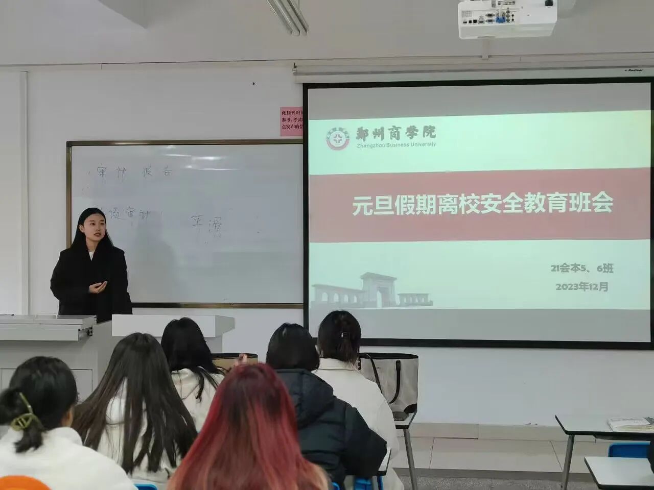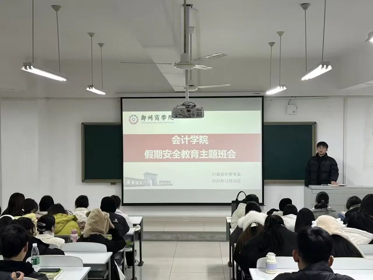班会伊始,各辅导员老师首先向同学们强调了元旦假期的始末,提醒同学们注意按时返校;接下来着重讲了注意元旦假期安全的重要性与具体注意事项,叮嘱同学们往返尽量乘坐公共交通工具、合理饮食、根据天气增减衣物与防火防电防溺水等注意事项;最后,提醒大家临近期末,要合理利用假期时间好好复习,祝愿大家期末获得一个好成绩。