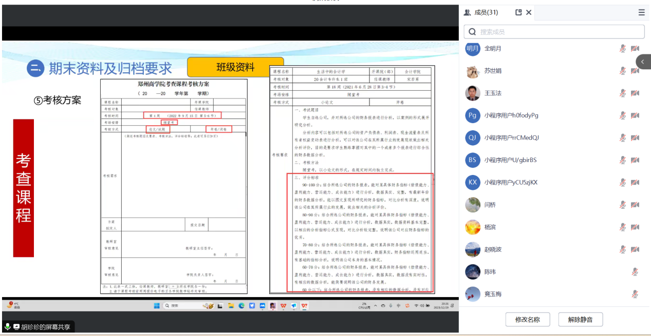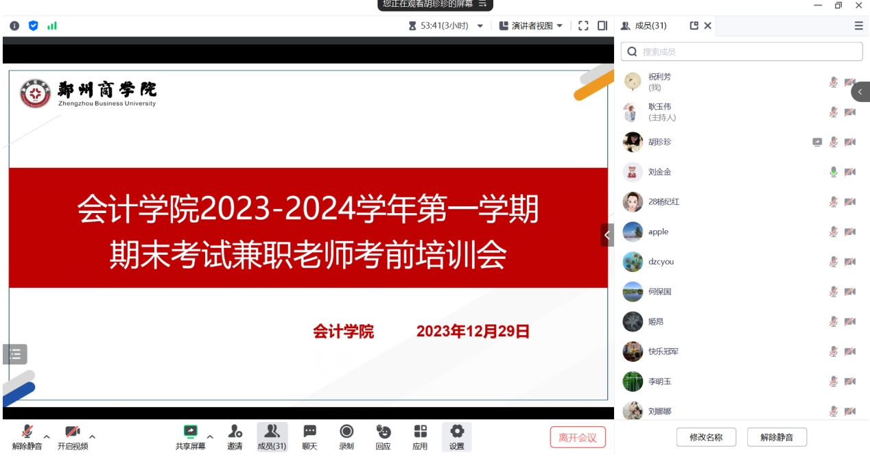 为进一步强化考风考纪建设,落实学校“严考”工作要求,强化期末考试过程管理,确保本学期期末工作顺利进行,12月29日晚上,会计学院通过腾讯会议召开期末考试兼职教师考前培训会,院长祝利芳、副院长刘金金、教学秘书耿玉伟、教研室主任胡珍珍及全体兼职教师参加了此次会议,会议由教学秘书耿玉伟主持。