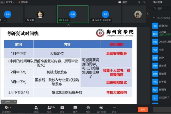 武老师围绕考研结束后的时间节点、复试、调剂、就业等事项为大家进行了指导讲解,提醒学生仍要对自身学业、复试准备等保持高度关注,希望同学们能够找准定位,提前做好规划。鼓励大家树立正确升学和就业观,立足自身优势与特长,激发内驱力和潜力,认清形势,努力学习。同时,也鼓励初试感觉不理想的同学不要气馁,打起精神做好接下来的计划和安排。
