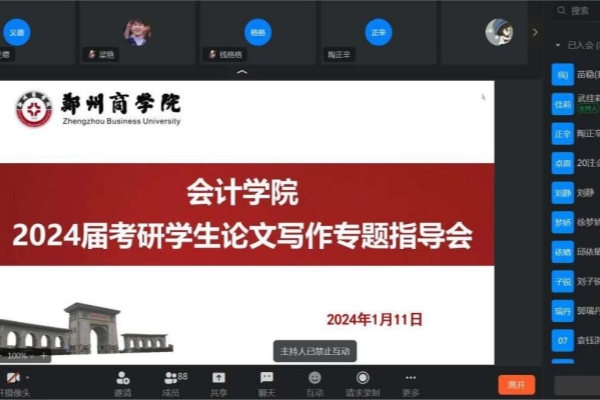 为加强学生学术规范和学术道德教育,帮助同学们进一步了解学位论文写作标准、提升学位论文写作质量、把握最新考研动态、开拓考研思路,会计学院于1月11日晚在线上开展2024届考研学生论文写作专题与考后安排指导会,会议由武佳莉老师主持,苗稳副教授以及2024届考研学生参加。