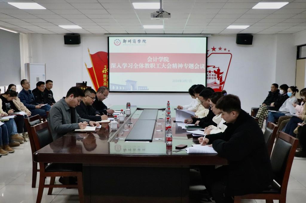 为深入学习贯彻2023-2024学年第二学期全体教职工大会董事长讲话和吴建军书记、吴泽强校长党政工作报告精神,结合学院工作实际,3月7日上午,会计学院在广恩楼103会议室召开深入学习全体教职工大会精神专题会议,校党委副书记兼纪委书记裴晓涛、学务长路程、质评中心主任张晓辉、会计学院院长祝利芳、党委书记刘宏涛以及会计学院全体教职工参加会议,会议由学院党委书记刘宏涛主持。