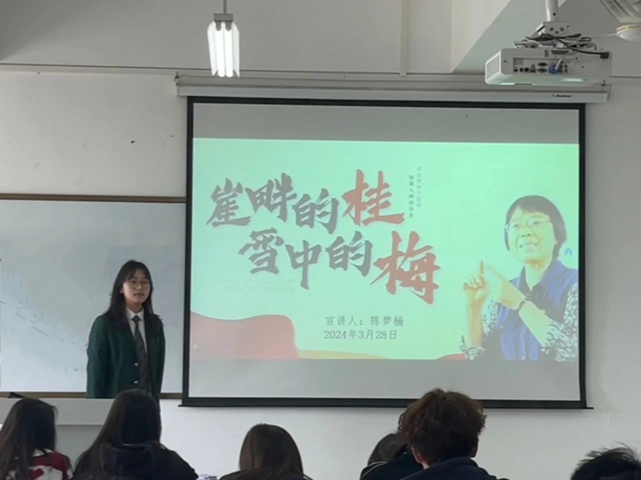 宣讲员从“人物背景,人物事迹,人物精神”三部分详细讲述张桂梅女士平凡且伟大的一生,带领大家认识了数十年如一日,一息尚存,志向不改,信念不衰的优秀教师张桂梅女士。最后以张桂梅女士所说的“如果说我有期盼,那是我的学生;如果说我有动力,那就是党和人民”作结,鼓励同学们坚定理想信念,主动担当作为,为实现自己的人生价值不懈奋斗!
