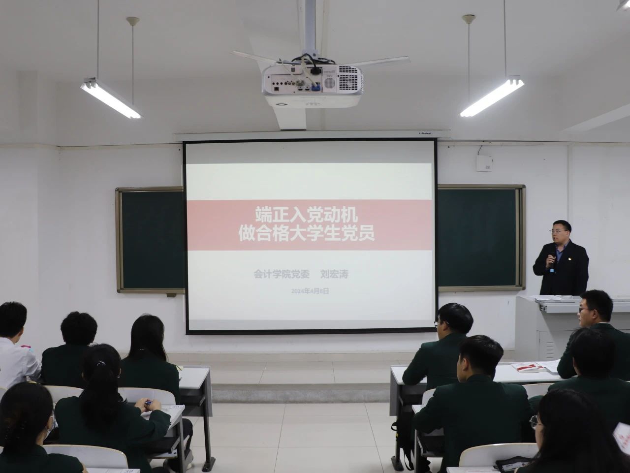 为提高入党积极分子的思想认识,坚定理想信念,4月8日晚,会计学院在广恩楼104教室开展第38期入党积极分子党课培训第五讲,此次党课由会计学院党委书记刘宏涛担任主讲。