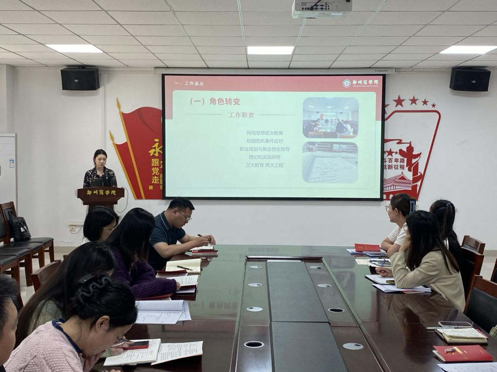 方一诺老师由辅导员角色定位、工作职责和基础业务三个方面分享了入职以来的学思感悟,系统总结了工作中遇到的困惑和解决思路,为辅导员业务工作开展提供了借鉴和反思。