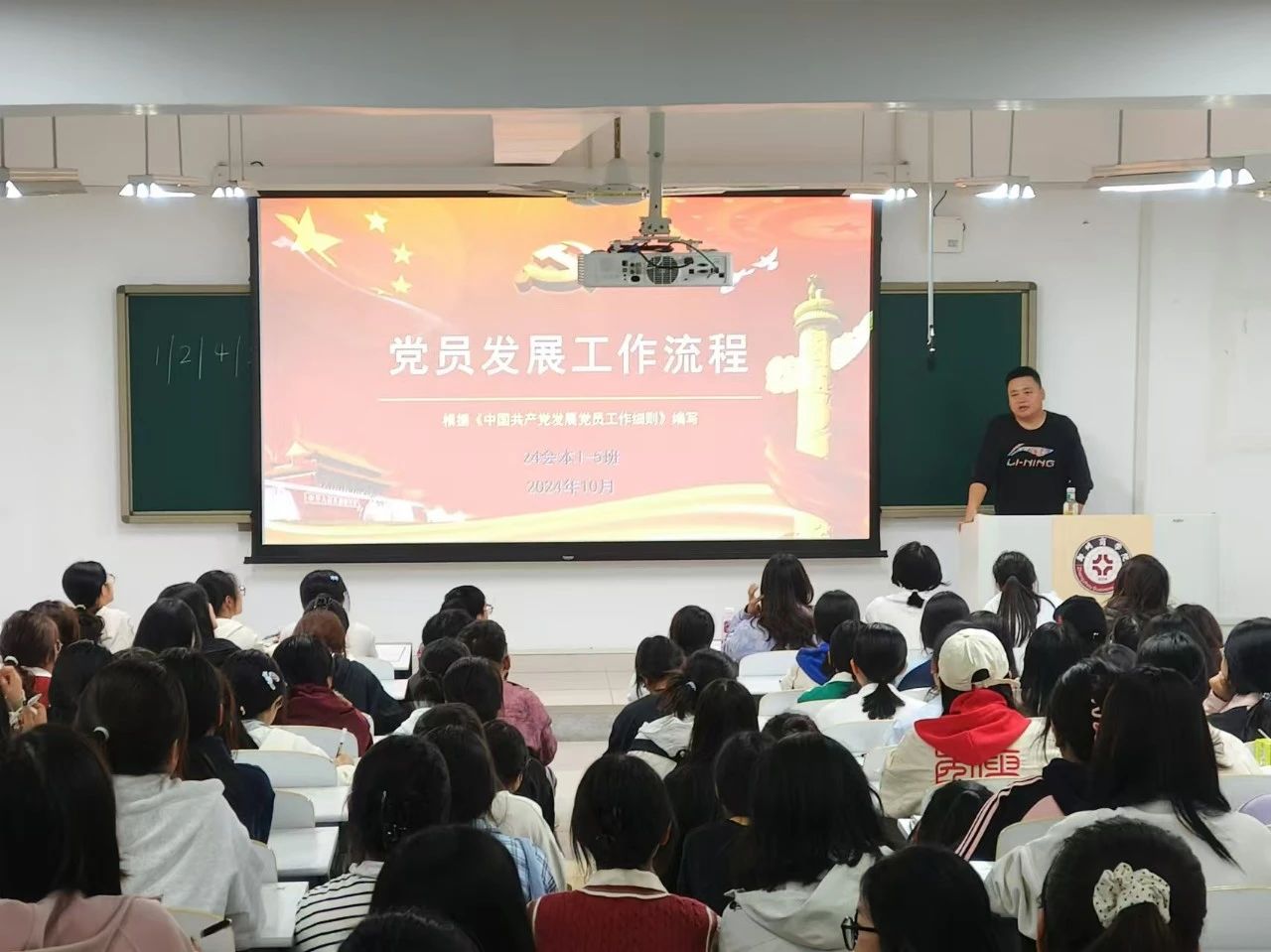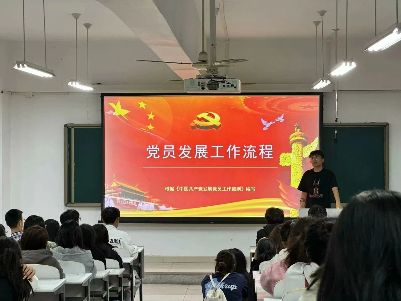 我院新生辅导员利用班会时间对“党员发展工作流程”知识进行宣讲,班会上,详细为同学们讲解了党员发展的工作流程,从提交入党申请,入党积极分子确定培养,发展对象确定考察,预备党员的接收,到预备党员的教育、考察和转正均进行了解读,让新生们对党员发展有了全面的了解。