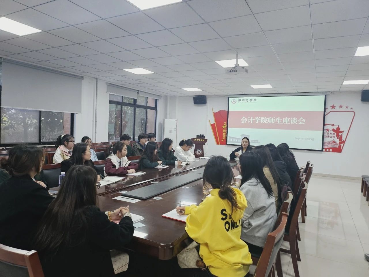 为了解学生生活情况,交流讨论并解决学生在日常生活中产生的问题,10月23日,会计学院于广恩楼103会议室举行师生座谈会,会计学院行政秘书兼团委书记孙柳阳及各班学生代表出席会议。