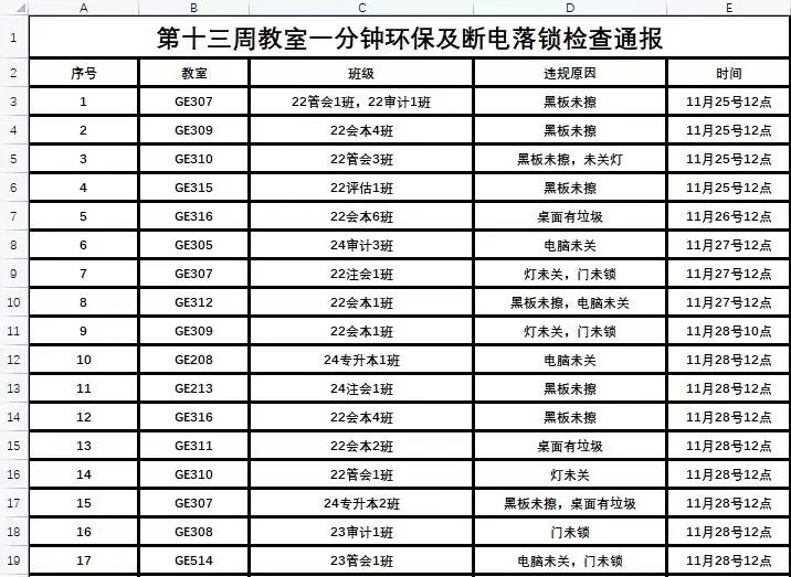 以下为本周“一分钟环保”巡查结果,希望各班同学将“一分钟环保”意识牢记于心,做到实处,为营造干净的教室环境贡献出自己的一份力量。