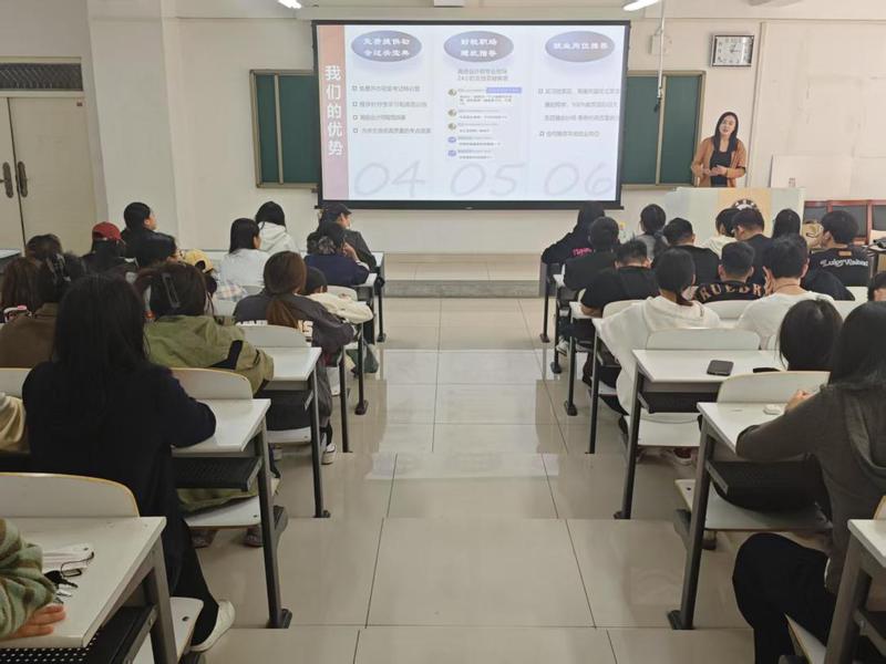 本次宣讲会分为企业宣讲和答疑环节两个部分。活动伊始,中企盈飞经理毕显娟向同学们介绍了公司的自身优势。她指出,公司为实习生提供学徒制就业服务,手把手带教,这有效实现知识在实际工作中的应用,可以提高工作效率,使毕业生更快适应工作。同时,她强调公司还为学生提供岗前培训,帮助学生适应从校园到企业的过渡,优化知识与实践的配对。随后毕经理通过实拍照片向同学们展示了公司为员工提供的干净整洁的工作环境和现代化办公区域。她还通过视频的方式介绍了公司举办的团建活动,弘扬了公司人性化的企业文化。