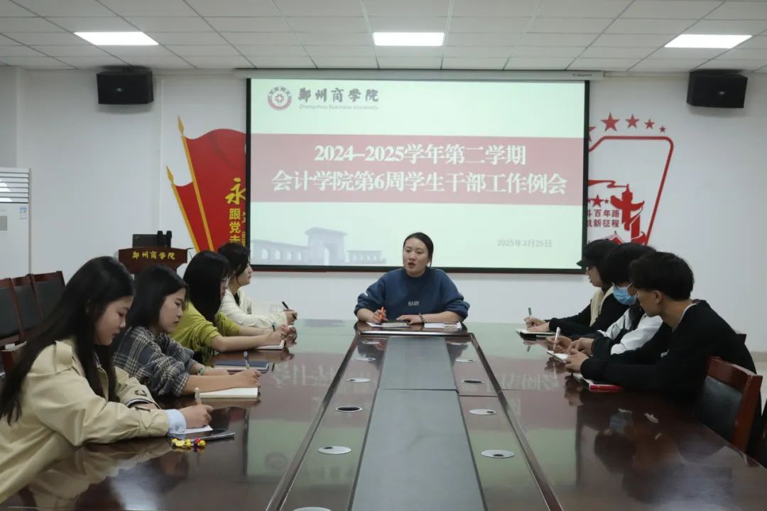 为积极响应学校号召,认真筹备多项校园活动,丰富同学们的课余生活,提升校园文化氛围。3月25日,我院在广恩楼103会议室组织召开第六周学生干部工作例会,本次会议由会计学院行政秘书兼团委书记孙柳阳老师主持,全体学生干部共同参与。