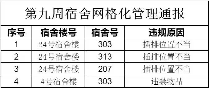 以下为本周例行检查结果,希望以下宿舍相关同学遵守相关规定,及时调整,共同构建和谐文明宿舍。