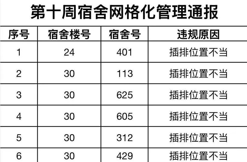 以下为本周例行检查结果,希望以下宿舍相关同学遵守相关规定,及时调整,共同构建和谐文明宿舍。