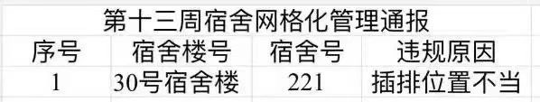 以下为本周例行检查结果,希望以下宿舍相关同学遵守相关规定,及时调整,共同构建和谐文明宿舍。