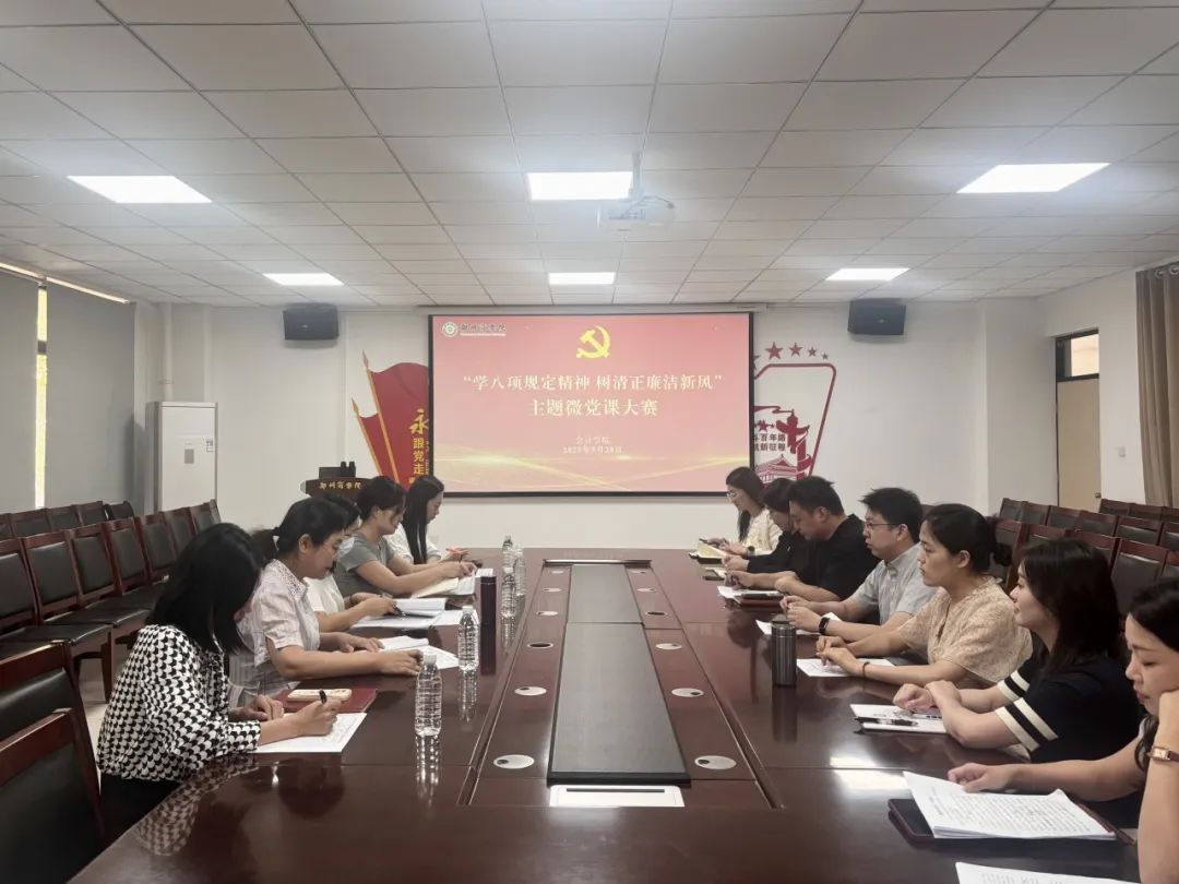 为深入贯彻落实党的二十大和党的二十届三中全会精神,扎实推进深入贯彻中央八项规定精神学习教育,持续巩固深化党纪学习教育成果,5月28日下午,会计学院于广恩楼103会议室举办“学八项规定精神,树清正廉洁新风”主题微党课大赛,我院部分支部书记及教师党员参加本次比赛。