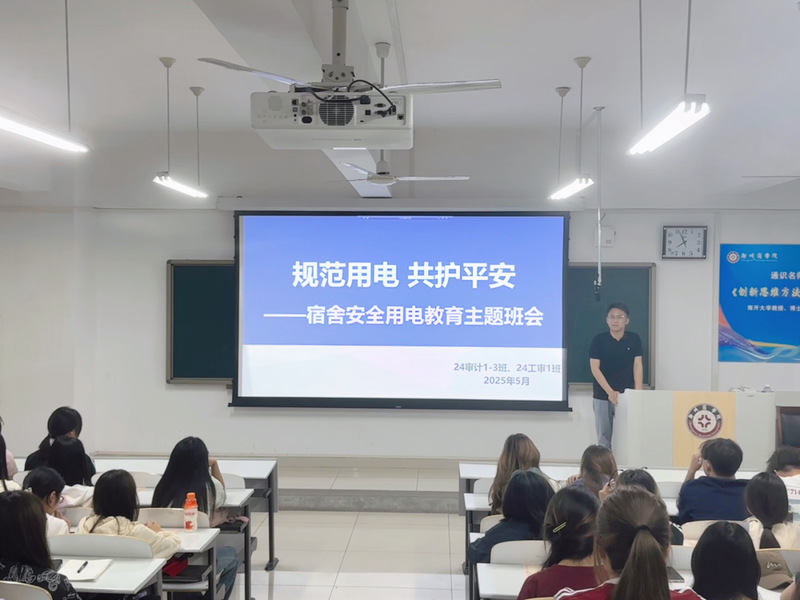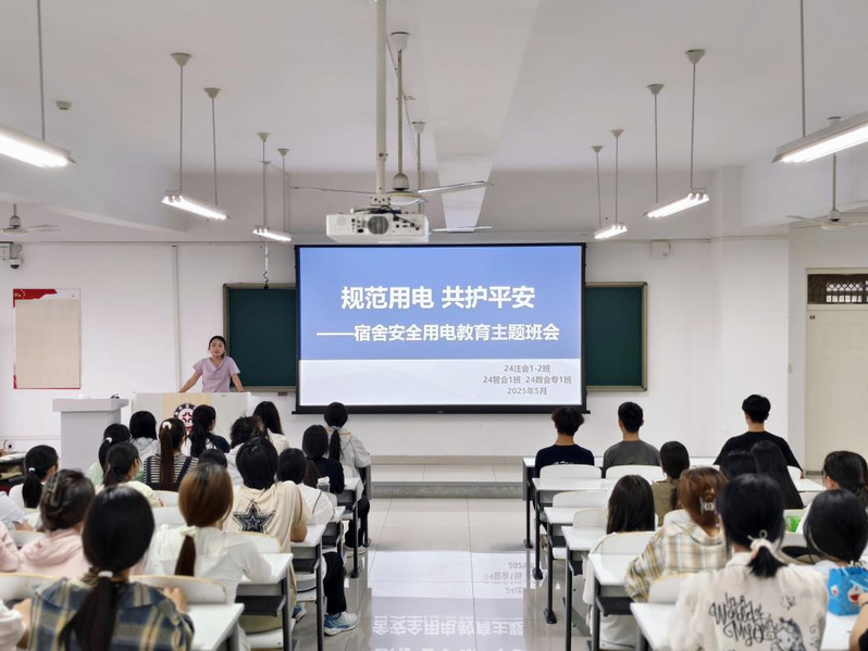 本次班会内容主要围绕着“宿舍用电现状、常见用电隐患、安全用电原则、应急处理办法”四个方面展开教育。班会伊始,辅导员老师结合以往高校宿舍火灾案例,强调了安全用电的重要性,并指出近期随着气温的升高,各宿舍用电量逐步增多,从而应更加规范用电行为;随后详细讲解了宿舍安全用电规范,包括禁止使用大功率电器、避免私拉乱接电线、人走断电等注意事项,并为学生讲解相应的应急处理办法,确保安全用电意识深入人心。
