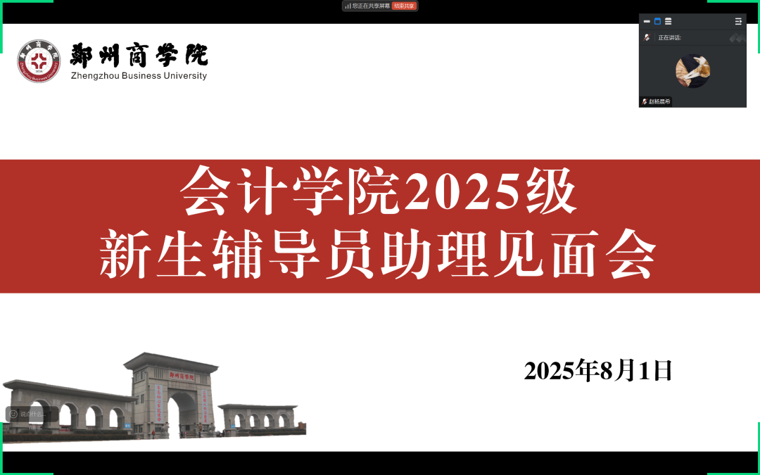 为帮助新生新生辅导员助理清晰梳理工作内容、提升履职能力,保障迎新工作有序推进,8月1日,我院于线上召开2025级新生辅导员助理见面会。本次会议由新生辅导员助理团团长赵梦婷主讲,会计学院行政秘书兼团委书记孙柳阳老师及全体新生新生辅导员助理参加。